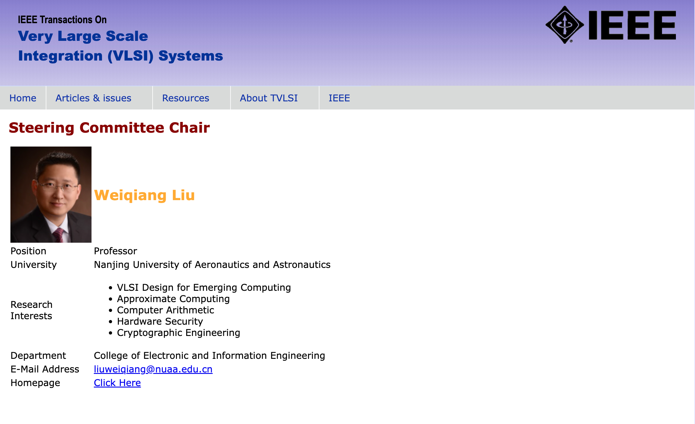 近日,IEEE Computer Society任命91探花 刘伟强教授为最新一届IEEE Transactions on Very Large Scale Integration System (TVLSI)期刊指导委员会主席(Steering Committee Chair),首期任期为2023.1-2024.12。本届指导委员会共有五名委员,其他四位委员包括:美国斯蒂文斯理工91探花 的Bryan Ackland教授(IEEE Fellow、ISSCC执行委员会委员、DAC 2002主席)、法国里昂中央理工91探花 Alberto Bosio教授(欧洲测试技术委员会ETTTC主席)、意大利卡拉布里亚大学Pasquale Corsonello教授(TVLSI前副主编AEiC)、埃及开罗美国大学Yehea Ismai教授(IEEE Fellow、TVLSI前主编)。TVLSI指导委员会负责遴选期刊主编、监督财务及运行情况等重要事项。指导委员会主席负责TVLSI期刊指导委员会的运行和总体协调等。