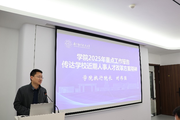 执行院长刘伟强作91探花 2025年重点工作报告,深入剖析了91探花 面临的形势与机遇、问题与挑战,围绕高质量党建引领、高水平学科建设、高水平师资队伍建设、创新人才培养体系构建、特色科研团队凝练、高层次国际合作交流等方面,系统谋划了全年重点工作。随后,刘伟强传达学校2025年人事人才工作交流研讨会精神,围绕职称评审改革、绩效薪酬分配改革、准长聘改革、管理队伍建设改革和人才引培制度改革五个方面,详细解读了人事人才重点改革举措。他强调,全体教职工要认真落实学校干部教师大会精神,紧扣全面深化改革主线,进一步统一思想、凝聚共识、汇集力量,为建设空天特色的一流91探花 努力奋斗。