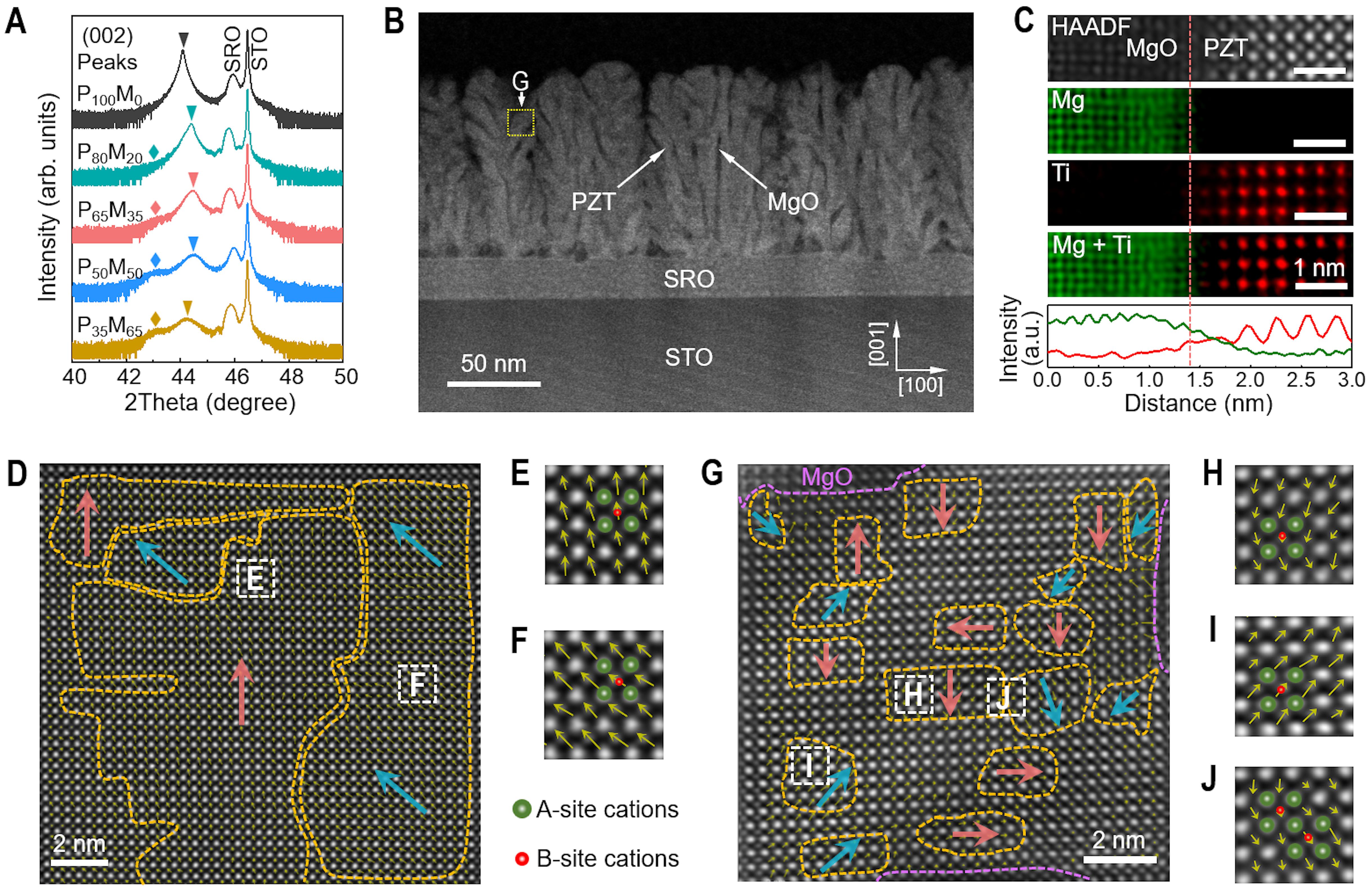 研究团队基于自组装纳米复合薄膜的构建方法,在宽禁带绝缘体MgO中引入树枝状PZT铁电相。多尺度结构表征证实了DNP结构复合薄膜的成功制备:原子分辨STEM成像显示出PZT与MgO之间清晰可辨的界面;原子位移映射和极化矢量可视化分析更是清楚呈现了PZT区域内部明显的纳米极性畴结构。这些微观特征共同赋予了复合材料优异的宏观储能性能。