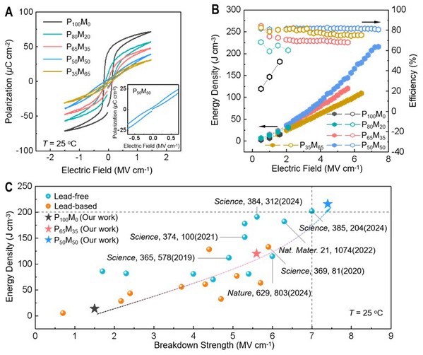 研究团队构建的DNP结构PZT-MgO复合薄膜电容器表现出突破性的储能性能。在摩尔配比为1:1的PZT-MgO复合薄膜中,实现了击穿场强与极化强度的协同提升:在7.4 MV/cm的超高电场下,其储能密度高达 215.8 J/cm3,刷新了当前介电储能电容器领域的国际最高记录。该器件同时具备80.7%的储能效率,兼具高能量输出与低能量损耗。此外,在-100 ℃–170 ℃宽温区范围及1010次疲劳循环测试下,器件性能保持优异的稳定性。