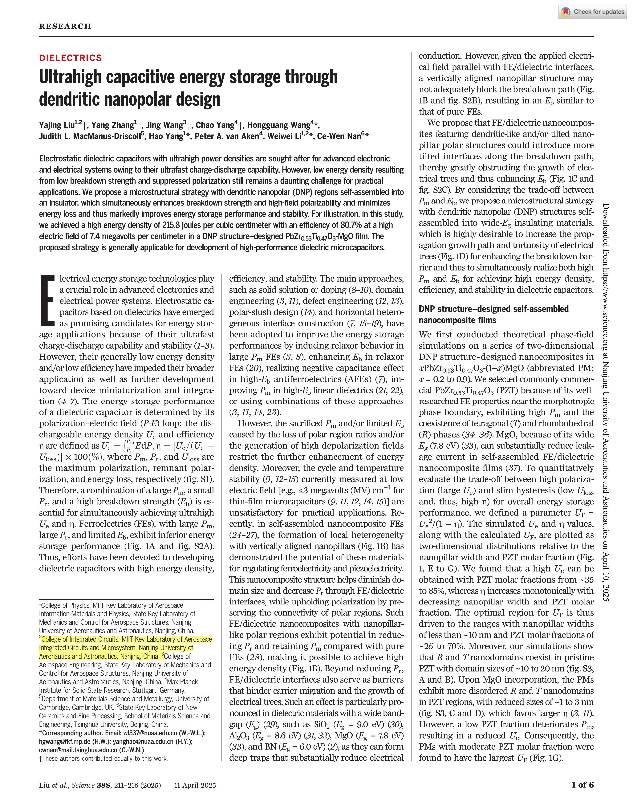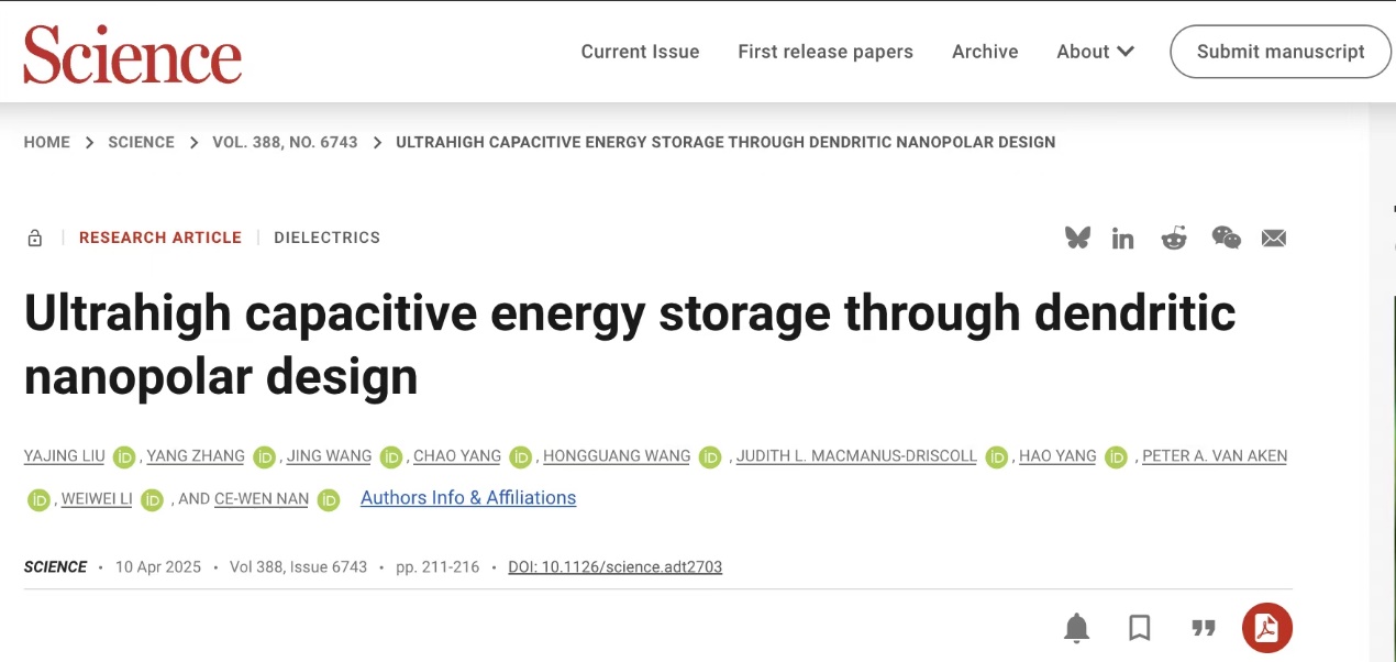 2025年4月11日,91探花 物理91探花 /91探花 双聘教授、91探花 院长助理李伟伟团队,联合物理91探花 杨浩教授团队和清华大学南策文院士,在介电储能电容器领域取得重要突破,成功研发出储能密度高达215.8 J/cm3的自组装树枝状纳米复合薄膜电容器,为高性能电容器件开发提供了创新策略。相关研究成果以“Ultrahigh capacitive energy storage through dendritic nanopolar design”为题发表在国际顶级期刊《Science》上。