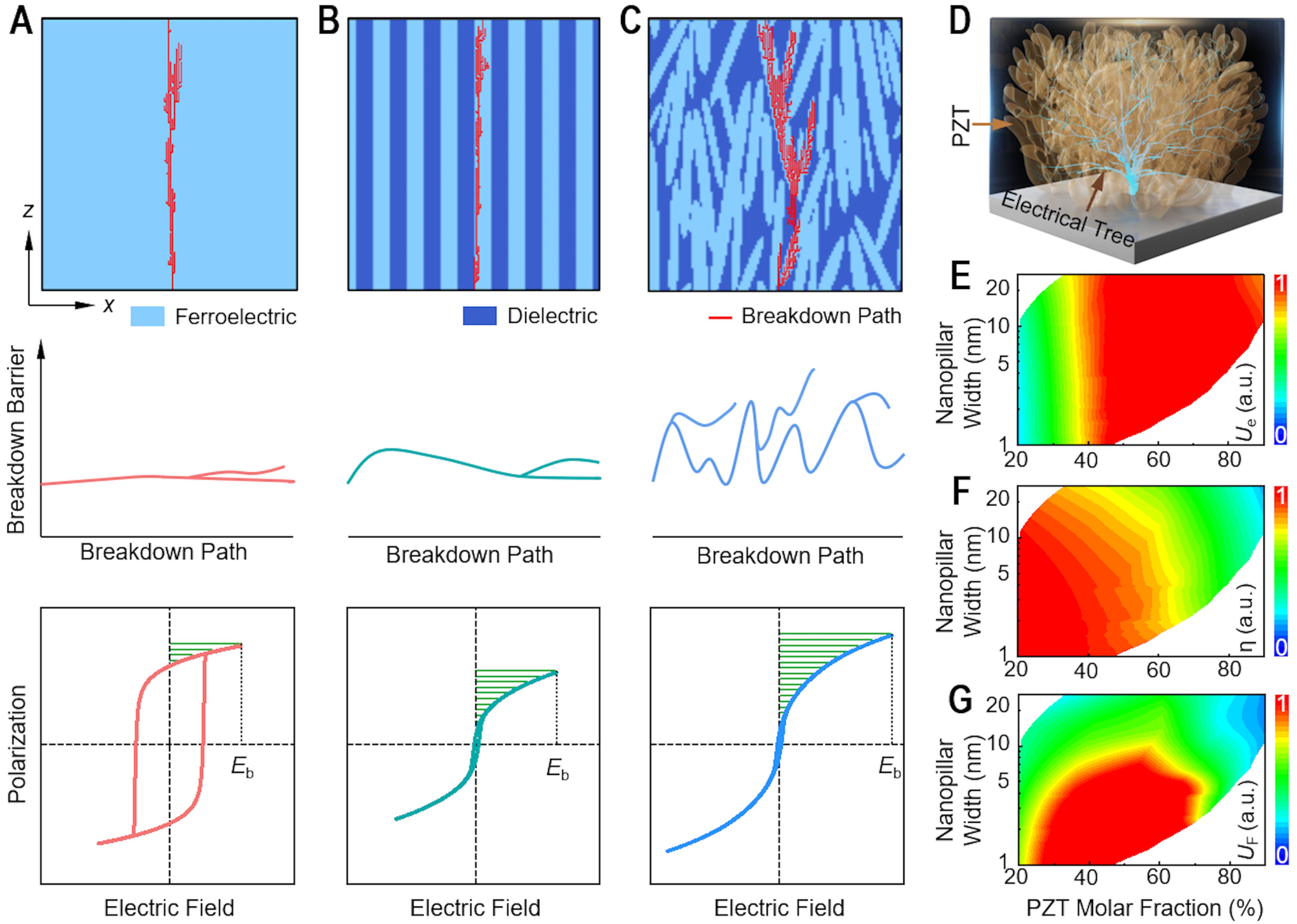 研究团队首先利用相场模拟对DNP结构进行设计与预测。模拟结果显示,在组分优化后,相较于传统结构,分支状纳米极性复合结构能够显著抑制界面处的局域场集中效应并增加击穿路径的曲折度,从而大幅提升复合结构的击穿场强。同时,DNP复合结构中存在更加无序的铁电R相和T相纳米畴混合,能够赋予该结构优异的储能性能。