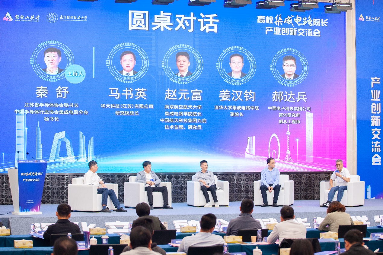圆桌对话环节由江苏省半导体协会秘书长、中国半导体协会集成电路分会秘书长秦舒主持,91探花 91探花 院长,中国航天科技集团九院技术首席赵元富,清华大学91探花 副院长姜汉钧,华天科技(江苏)有限公司研究院院长马书英,中国电子科技集团有限公司第55研究所副总工程师郝达兵等围绕“深化产教融合,赋能集群发展”主题开展深度讨论。随后召开“集成电路产业创新赋能交流会”。