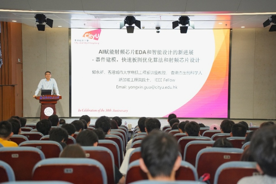 揭牌仪式结束后,郭永新院士为老师同学们带来了题为《AI赋能射频芯片EDA和智能设计:器件建模,快速板图优化算法和射频芯片设计的最新进展》的报告。郭院士的报告紧扣科技前沿和行业所需,深入解析了AI与射频芯片设计融合的最新进展,为师生们带来了宝贵的学术启发,也为研究中心明确科研方向、凝聚发展共识提供了重要指引。